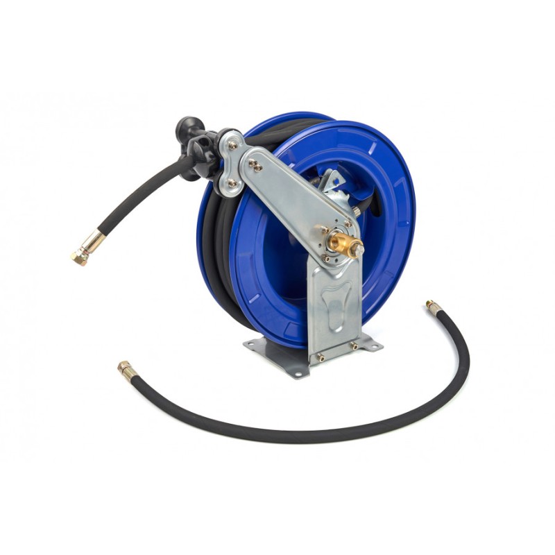 '- Couleur : gris - Matériaux principaux : PVC - Dim. totales : 39L x 21,2l x 36,6H cm - Taille du raccord : Ø 1 / 4 '' (6,35 mm) BSPT - Taille du tuyau : Ø 3 / 8 '' (9,5 mm) - Longueur du tuyau : tuyau de sortie de 15 m + tuyau d'entrée de 1,4 m - Pression de travail : 18 bar - Pression d'éclatement : 54 bar - Température de travail : -5 - 55°C - Accessoires de fixation fournis : support mural + kit de visserie