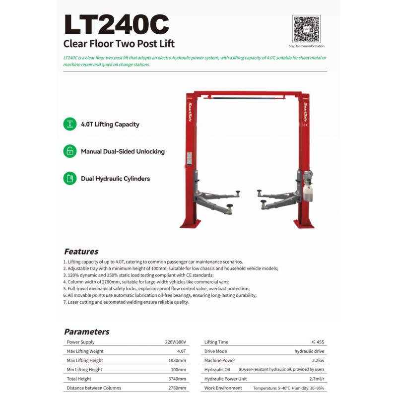 Le LT240C est un pont élévateur à double colonne de type portique avec un système d'alimentation électro-hydraulique, d'une capacité de levage de 4,0 T, adapté aux postes de travail tels que la réparation de métaux ou de machines et la vidange d'huile rapide.