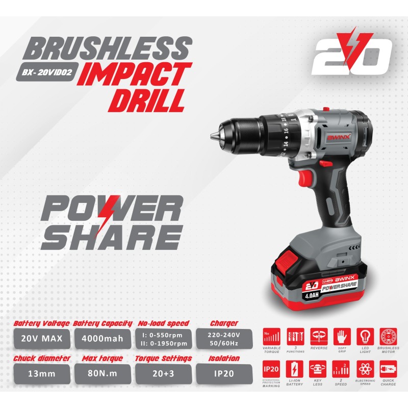 BWINX - BX-20VID02 - PERCEUSE - VISSEUSE A PERCUSSION 20 VOLT - CORDLESS A BATTERIE - 13 MM