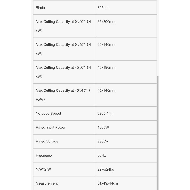 Blade 305mm Max Cutting Capacity at 0°/90° (H 65x200mm XW) Max Cutting Capacity at 0°/45° (H 65x140mm XW) Max Cutting Capacity at 45°/0° (H 45x190mm XW) Max Cutting Capacity at 45°/45° ( 45x140mm HxW) No-Load Speed 2800r/min Rated Input Power 1600W Rated Voltage 230V~ Frequency N.W/G.W 50Hz 22kg/24kg Measurement 61x49x44cm